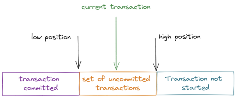 如果当前事务 id落在紫色部分,则表示该版本是已提交事务或由当前事务本身生成,并且该数据是可见的。 -