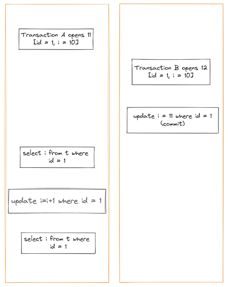 对于第二次的查询,按照可重复读隔离级别的可见性规则,事务 A 应该无法感知事务 B 中的更新,但是查询结果是 i=12 而不是 i=11,这是为什么呢?