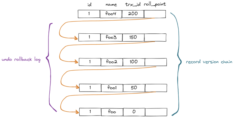 请注意,此处记录的版本并非真实的物理实体。实际上,只有最新的记录存在于真实的物理实体中,其他历史记录都是从 undo 日志中推导出来的。