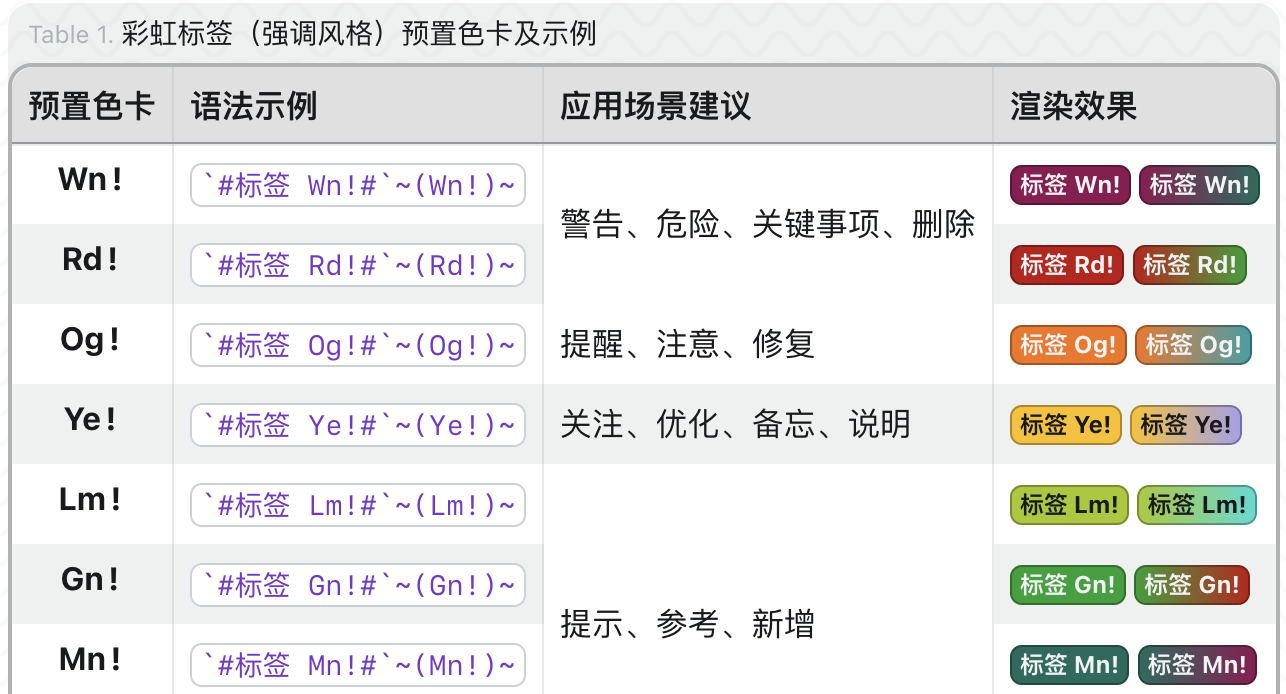 彩虹标签(强调风格)支持渐变色配置,如 `# 渐变色标签 #`~(RdOgBu!)~ …详细