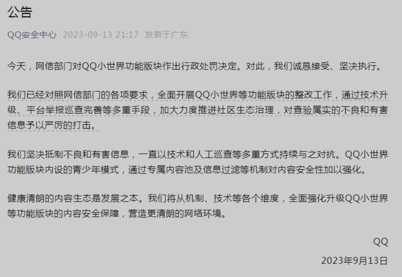 今天,网信部门对QQ小世界功能版块作出行政处罚决定。对此,我们诚恳接受、坚决执行。