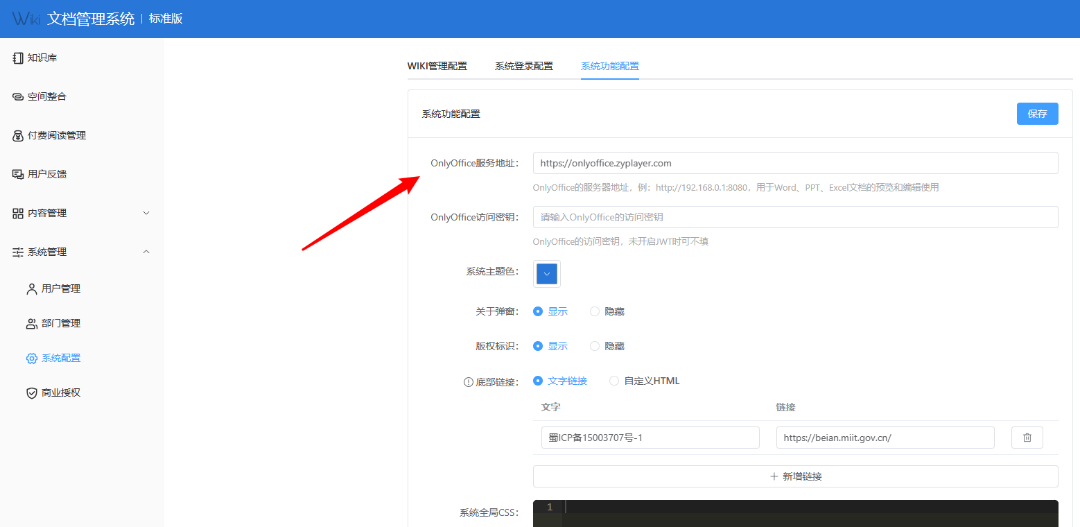 如果有在线查看和系统编辑Office文档的需求,可自行部署一套OnlyOffice,然后在系统配置中填入OnlyOffice的服务地址即可,接入后即可在系统中直接上传、新建、协同编辑与下载Office文档,体验更加完善。