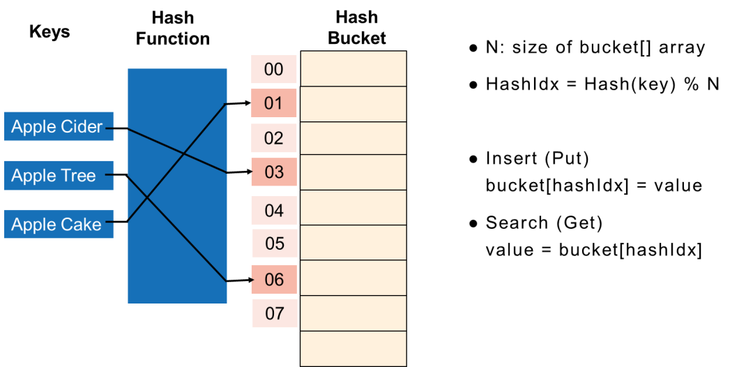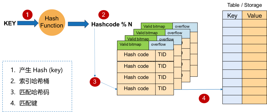 基本哈希索引使用哈希函数将键转换为整数,哈希值用于索引桶数组,所有具有相同杂凑(键)值的资料记录将进入相同的杂凑桶。