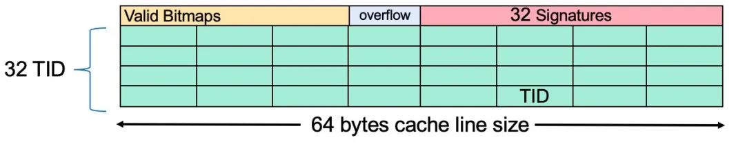 第一个缓存行包含:32-bit 有效位图、一个 8 字节溢出指针、32 字节签名;