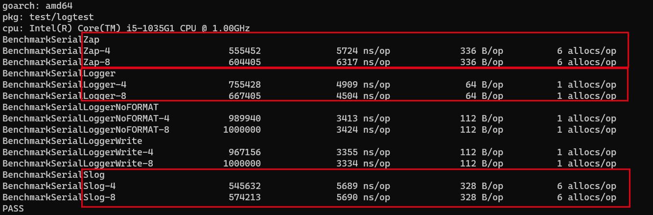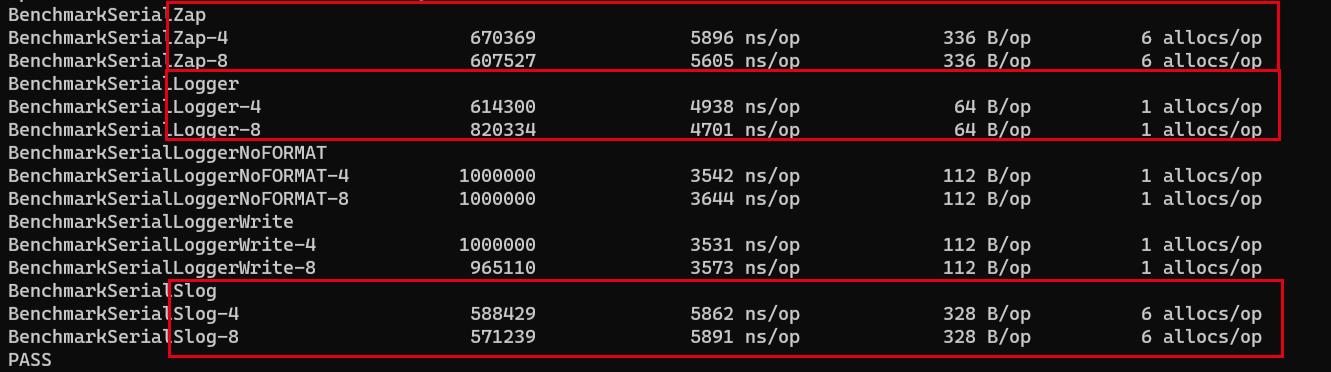 - 时间消耗: go-logger 4500ns/op左右 , slog与zap大致在5600ns/op 左右