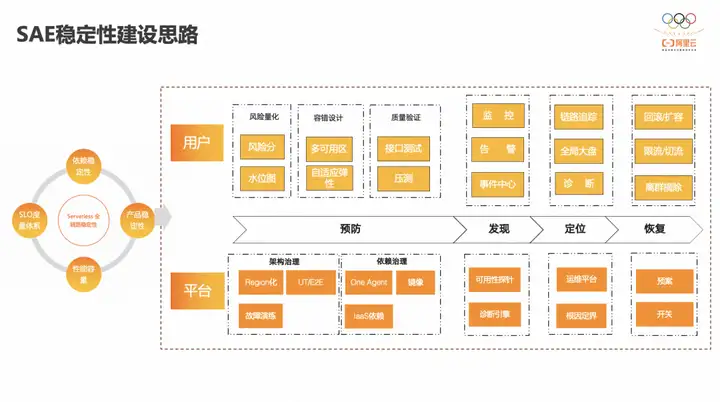 SAE 稳定性建设将会把整个故障处理流程划分为故障预防-故障发现-故障定位-故障恢复四个阶段,从平台视角来看,故障预防会聚焦于通过 region 化改造,UT,E2E 覆盖,故障演练等方式对 SAE 自身进行架构治理与升级,保证 SAE 后端服务的高可靠和高可用,同时也会针对 agent,镜像,IaaS 层依赖等相关产品进行依赖治理,收敛因关联上下游出问题所导致的连锁故障,故障发现主要依赖于诊断引擎以及运行时可用性探针来实现平台问题的第一时间感知,主动发现,并通过统一告警中心进行问题的及时触达。在问题定位的过程中会不断完善 SAE 运维平台建设,提升内部运维效率,完善根因定界能力,便于区分问题边界与原因,并要做好潜在风险的提前预案与新功能的 feature 开关,以便出现问题时能够快速止血,快速恢复。与此同时,将通过风险量化,容错设计,质量验证,可观测,事件中心,诊断等一系列产品化手段帮助用户闭环化解决自身问题,从而实现 Serverles 全链路的稳定。