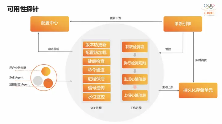 从图中可以看到,SAE 运行时可用性探针作为 sidecar 运行在用户实例中,其架构分为以下几个部分: