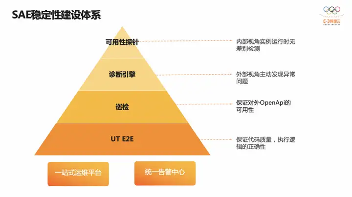 SAE 稳定性体系自底向上分为四个部分,分别为 UT/E2E,巡检,诊断引擎和可用性探针。首先通过提升代码 UT 覆盖度,扩充核心流程 E2E case 保证代码质量,保证程序执行逻辑的正确性,提前规避问题的产生。其次通过周期性巡检程序覆盖应用生命管理的核心流程,保证对外核心 OpenApi 的可用性和 SLA。通过建设 SAE 诊断引擎,以外部视角实时监听并消费各类数据源,经过模式诊断和根因定界流程产出事件告警,先于用户主动发现异常问题,同时建设 SAE 运行时可用性探针,在真实用户环境下对实例运行时进行无差别的检测,保证应用内部的运行环境符合期望,并且借助统一告警中心完成事件流转,实现问题高效触达,借助一站式运维平台白屏化运维操作,沉淀常用运维步骤,提升问题定位效率,从而全方位,多层次,立体化的覆盖各类异常问题,保障 SAE 应用的稳定性。