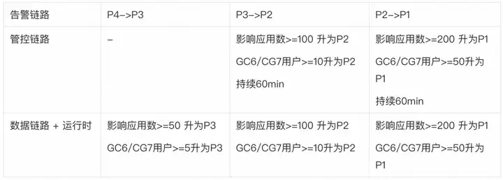 SAE 以产品核心 SLA 和 SLO 指标作为牵引,对全部存量告警和新增告警进行梳理并配置默认告警等级,同时实现了告警升级机制,在发出告警时统一告警中心将会对在产生告警与解决告警两者间的时间窗口内的所有同类型告警所影响的应用数,用户数,告警同环比增量进行统计,并根据升级策略判断是否应该升级告警。升级策略如下: