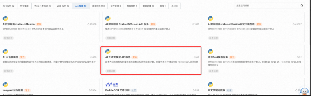 登录到阿里云函数计算控制台->应用->创建应用-> 人工智能选择 AI 大语言模型 API 服务应用模板点击"立即创建"。
