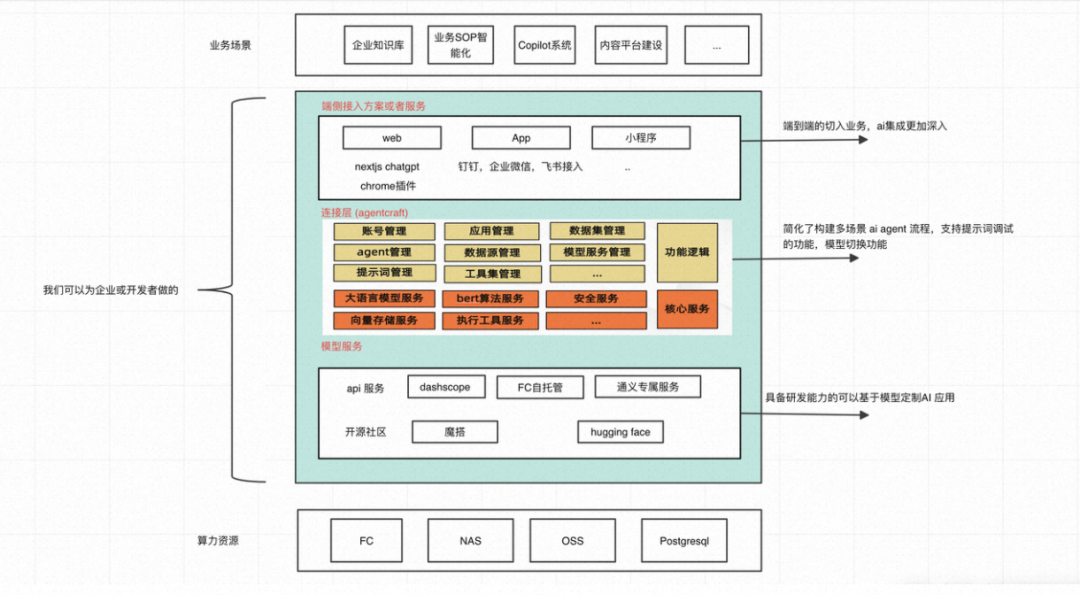 - 端到端的对接:单纯模型服务的 api 无法变成直接的生产力,需要完成【企业数据&企业 SOP】-> LLM 服务 -> 各种端侧的完整链路