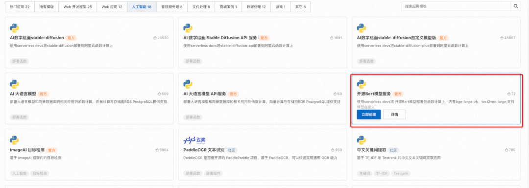 登录到阿里云函数计算控制台->应用->创建应用-> 人工智能选择 “开源 Bert 模型服务” 应用模板点击"立即创建"。