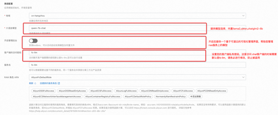 一、模型服务底座,函数计算可以部署来自魔搭,huggingface 等开元社区的 ai 模型,我们针对 LLM,Bert 等智能知识库/助手场景做了专门的定制,接入 OpenAI 兼容的 api 规范,提供一键部署的模版和可视化的 web 访问界面,帮助开发者或者企业快速上手 llama2,chatglm2,通义千问等模型的部署。