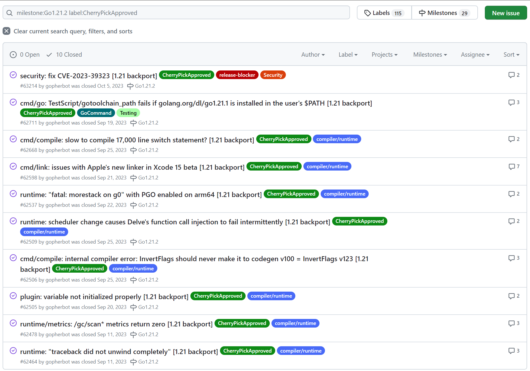 详情:https://github.com/golang/go/issues?q=milestone%3AGo1.21.2+label%3ACherryPickApproved