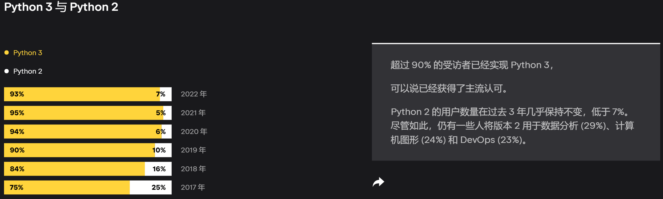 调查结果显示,7% 的 Python 开发者仍在使用 Python 2,93% 的开发者使用 Python 3。相比下在 2021 年度的调查中,95% 的开发者使用 Python 3,5% 的开发者使用 Python 2。