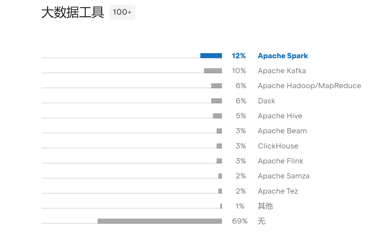31% 的 Python 开发者使用大数据工具,自 2021 年以来增长了 6 个百分点。在数据科学家中,这个数字达到 42%。
