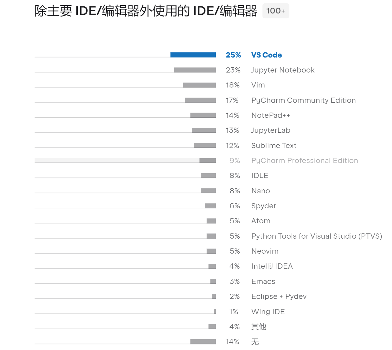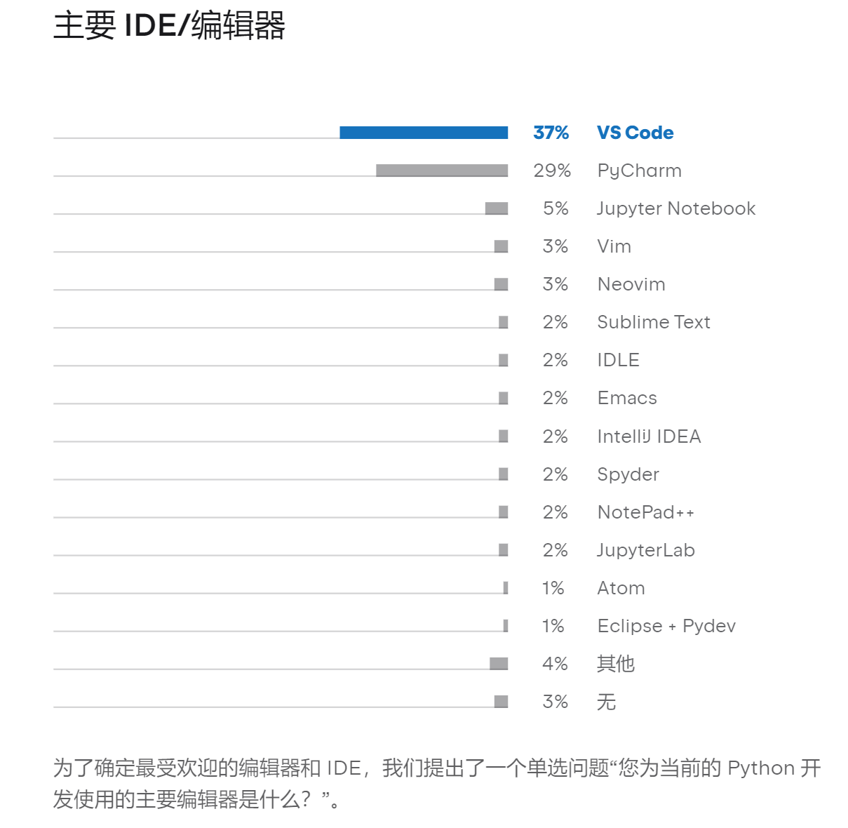 PyCharm 和 VS Code 是 Python 开发的前两大 IDE,有三分之二的受访者选择。