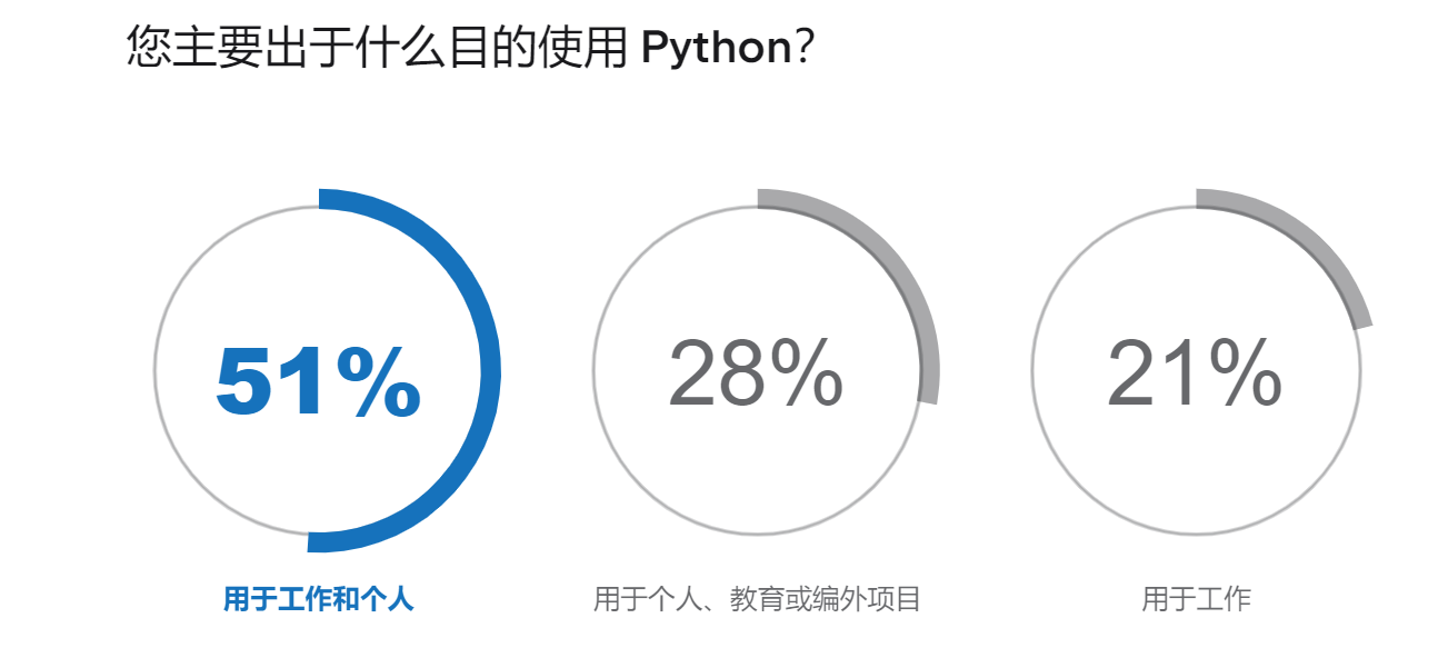 调查还发现,21% 的开发者表示只在工作中使用 Python,51% 将 Python 用于工作和个人/教育用途或业余项目。