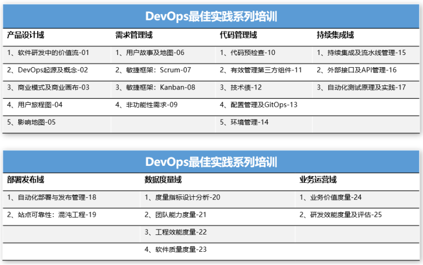 为了帮助社区成员解决以上问题,我们特别推出了一套针对技术社区的《DevOps落地实践训练营》。这个训练营将带您全面了解DevOps的核心理念和实践方法,从产品设计、需求管理、代码管理、持续集成、部署发布、数据度量、业务运营等各个领域,带您端到端的学习DevOps相关知识。