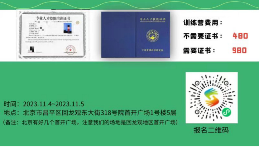 4、“天下苦高价培训久矣。”本次训练营,以480元的价格提供了一种高性价比的培训方式,让学员不再因价格而犹豫。如果你想在学习技能的同时,还想获得一个职业技能证书,980的价格,你就能获得由”中国管理科学院“颁发的《专业人才培训证书》。此处注意,培训和证书并不强制绑定,本土培训,仅此一家。