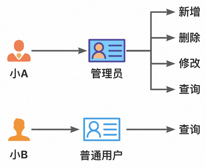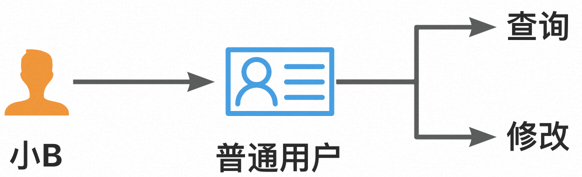 同理,对于小B来说,认证就是小B登录系统后,会授予普通用户的角色,授权就是授予小B查询的权限。