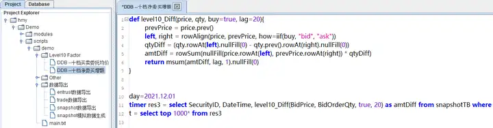 十档净委买增额的计算需要的参数分别为 BidOrderQty、BidPrice 两个字段,均为数组向量数据类型。首先通过行对齐函数 rowAlign 实现当前十档价格和前一个十档价格进行行对齐,然后通过 rowAt 和 nullFill 函数分别获取对应档位的委托量和实现价格进行对齐,最后计算总的变化额。