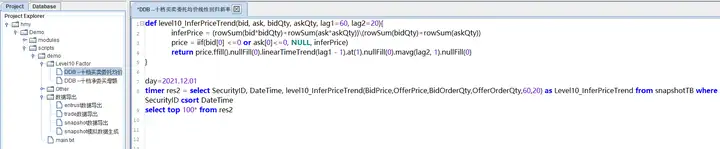 十档买卖委托均价线性回归斜率的计算需要的参数分别为 OfferOrderQty、BidOrderQty、OfferPrice、BidPrice 四个字段,均为数组向量数据类型,分别为买卖十档价格和十档委托数量。使用 rowSum 这一内建聚合函数提高了因子的计算效率。通过 linearTimeTrend 函数获取因子值对时间 t 的滑动线性回归斜率,该函数返回线性回归的截距和斜率。price.ffill().linearTimeTrend(lag1-1).at(1).nullFill(0).mavg(lag2, 1).nullFill(0) 表示获取十档买卖委托均价对时间t的线性回归的斜率。