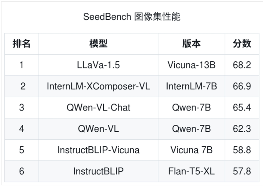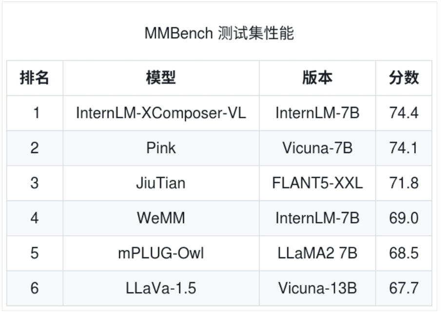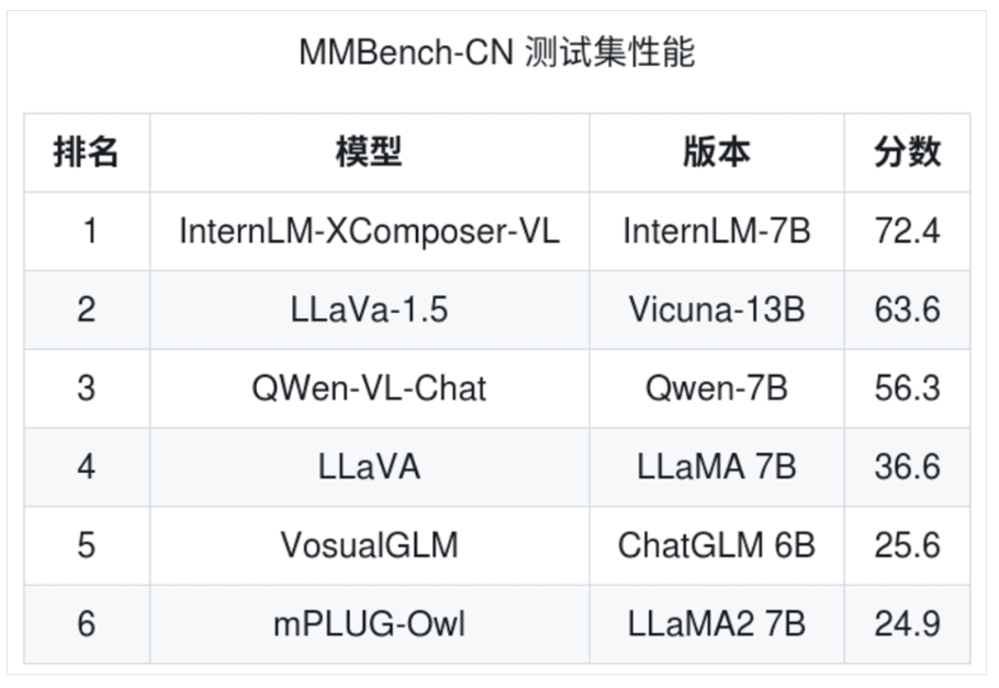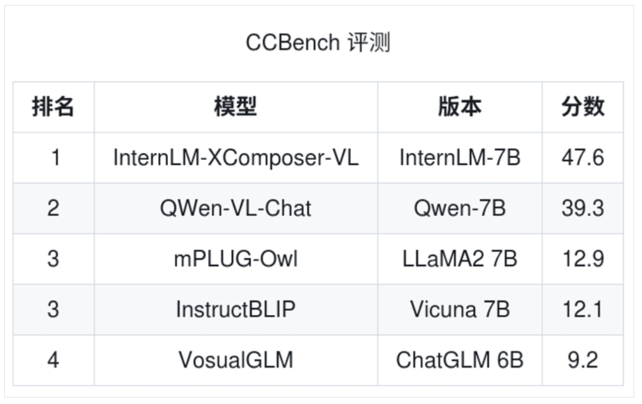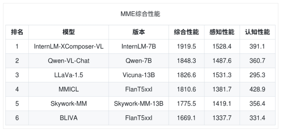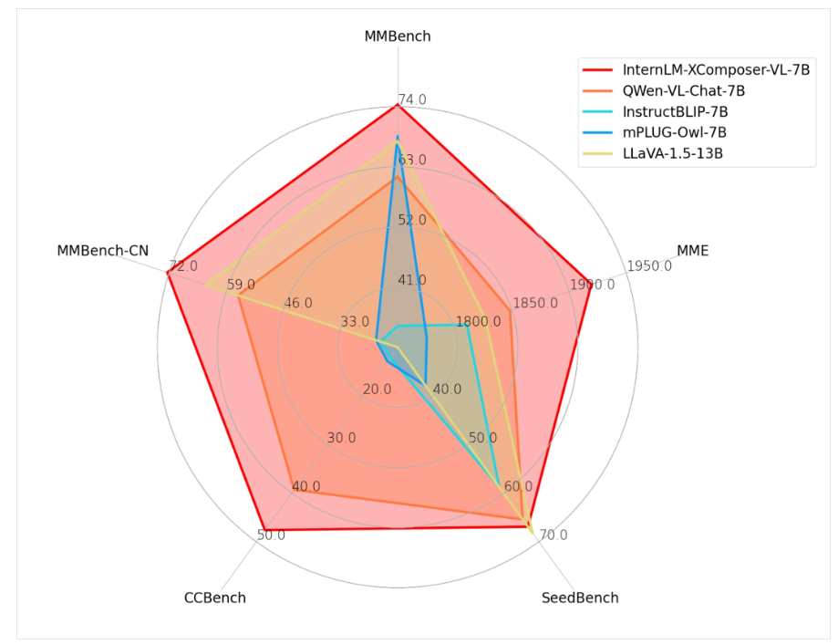 研究人员采用5个主流的多模态大模型评测对InternLM-XComposer-VL-7B的能力进行了详细测试。