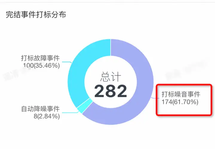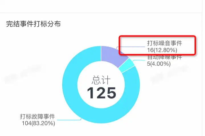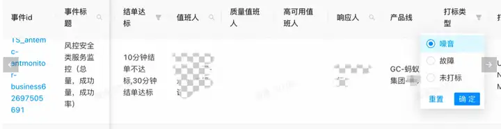 利用集团的极光报警数据看板可以非常简单的看到噪音数和故障数等数据,以及五分钟发现率和三十分钟完结率(衡量应急效率的重要指标),从而获取针对性的改进信息。同时可以对打标类型选择噪音进行筛选,并定位到对应事件,以及其对应事件id匹配的监控进行针对行监控降噪治理。