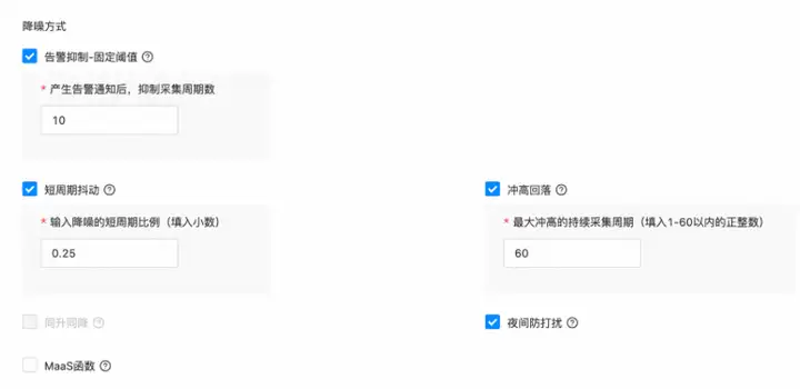 a.告警抑制:告警抑制可以帮助在大量报警风暴的情况下进行降噪,设置抑制采集周期数(如周期为一分钟,则设置周期数为5则抑制五分钟报警)。