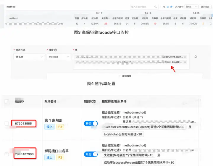 1.应用调用下游接口成功率监控,如果存在部分接口因业务问题造成失败,或部分外部调用接口经常失败且无影响,我们就需要将其进行单独配置监控。首先通过噪音打标场景查出经常报警且标记为噪音的接口,在监控处通过黑白名单,黑名单过滤掉噪音接口,并对其配置一项敏感度较高的阈值,再配置一个监控,将这些接口加白,白名单部分减少监控敏感度。