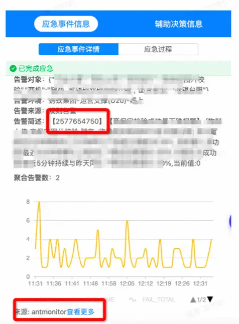 利用应急事件详情可快速定位对应监控,其中红框是监控id,对应于antmonter(集团监控系统)所配置报警监控。
