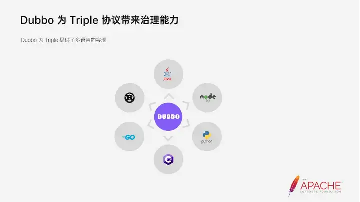 同时 Dubbo 为 Triple 提供了多语言的实现。目前会在 Rust、Go、Java、JS、node、Python 这几部分实现官方的实现。这样用户就不用自己根据实验协议的 spec 去实现了。如果你有一些定制需求,比如内部的一些框架,你根据 spec 实现也是可以的。