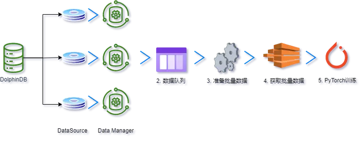 DolphinDB Python API 自 1.30.22.2 版本起提供深度学习工具类 DDBDataLoader,提供对 DolphinDB SQL 对应的数据集进行批量拆分和重新洗牌的易用接口,将 DolphinDB 中的数据直接对接到 PyTorch 中。