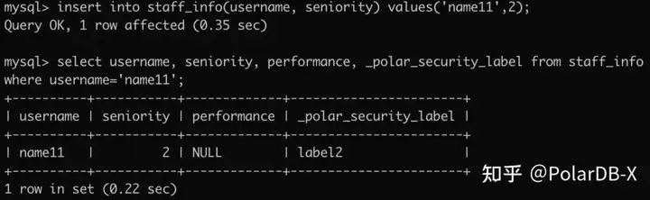 PolarDB-X规定,当用户插入记录不包含PSL列时,该行的PSL列值默认为当前用户的write_label。所以从执行结果可以看出,name11员工的PSL列值为label2。