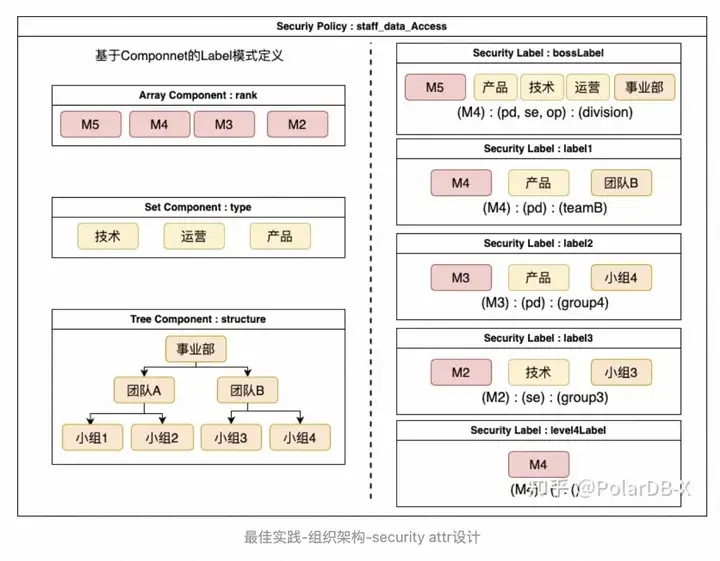 安全策略定义了安全标签的模式,其内部包含的安全标签必须遵守该模式,这里定义了staff_data_access安全策略,其内部的安全标签必须由rank,type,structure三个安全标签组件构成。