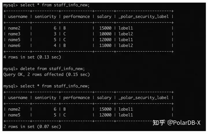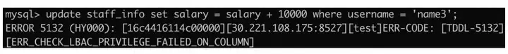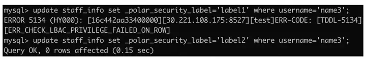 PolarDB-X规定,当用户更新数据表中的PSL列的值时,必须保证当前用户的write_label大于等于新的label值。所以从执行结果可以看出,当将name3员工的PSL列更新为label1时,SQL执行失败,更新为label2时,SQL执行成功。