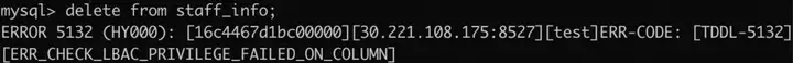 为了验证PolarDB-X数据库的LBAC访问控制能力,下文以tmb_pd_ld用户身份登录,测试Select、Update、Insert、Delete四种SQL语句的执行情况。
