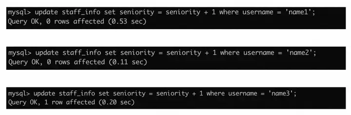 - 当前用户无法读取name1员工的数据行,所以更新了0行,并没有更新成功。