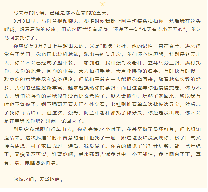 他拍狗,一只名叫"欢记”的狗2007年来到家里,就开始记录,2021年,13岁的欢记不辞而别,杜键文将所有影像资料剪辑成五分钟多的短片发在了b站上,还写了一篇文章缅怀欢记。
