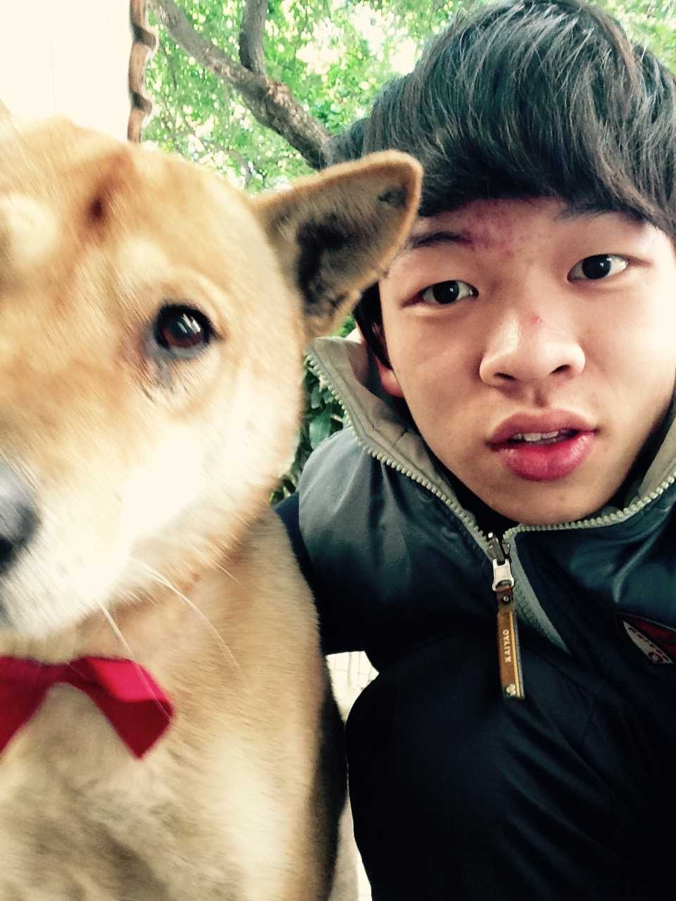 2016年除夕,杜键文和家里的小狗欢记合影 |