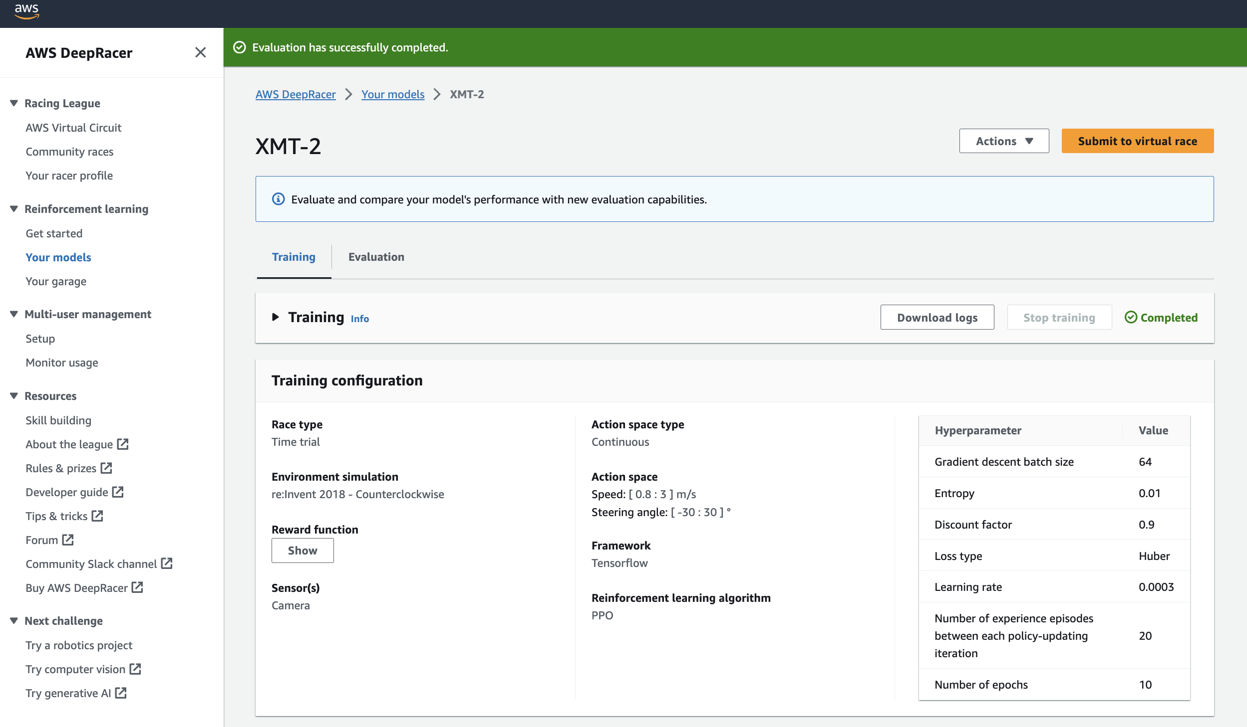 DeepRacer提供的仿真环境让用户可以在虚拟世界中进行实验和测试,以便更快地迭代和改进驾驶策略。用户可以使用强化学习算法来训练车辆在赛道上驾驶,通过奖励和惩罚来指导智能代理在各种情况下做出最佳决策,根据不同赛道,自定义奖励函数,调整神经网络训练的超参数以及赛车运行的速度和角度,从而在训练出模型后,可以让自己的赛车在虚拟跑道以及真实赛道上完成自动驾驶。