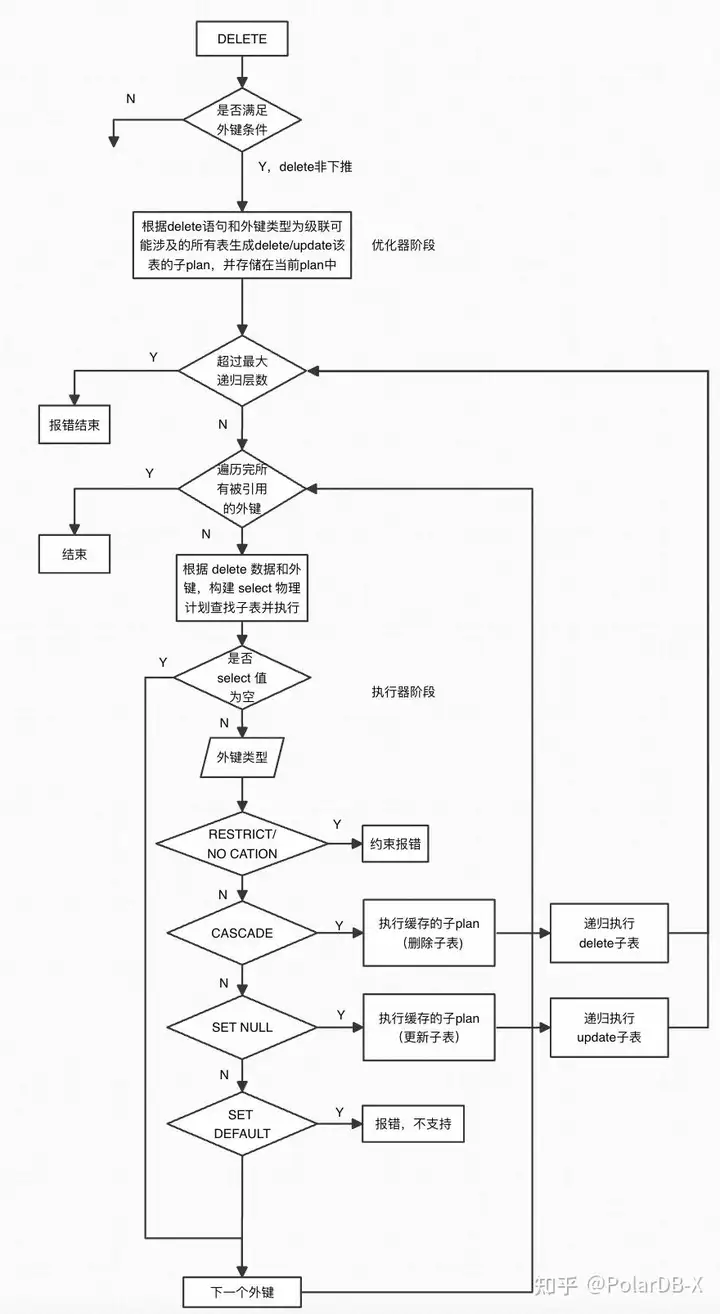 问题:当外键涉及级联操作时,通常的想法是先去子表中查询是否存在需要级联的数据,如果存在,则构造相应的执行计划。由于需要先查询数据,再根据查询的数据决定是否进行外键的约束或级联,那么整个流程就会实现在执行器阶段,并通过查询出的数据构造物理计划,但在分布式数据库中会面临很多难以解决的问题,如:
