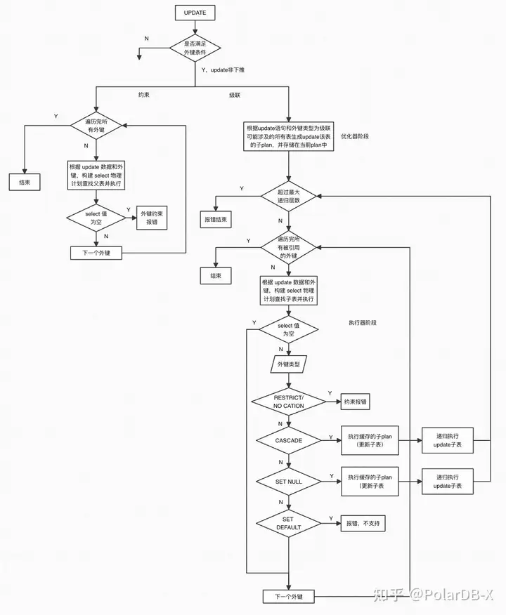 - 由于拓扑中可能同时包含物理与逻辑外键,若当前外键不下推,则 select 出数据后,执行 delete/update 逻辑计划;若当前外键下推,存储层会在各自分片行执行级联操作,计算层仍需要 select 出数据,但不需要执行当前的 delete/update 逻辑计划,这是为了确定是否需要进行后续的级联,