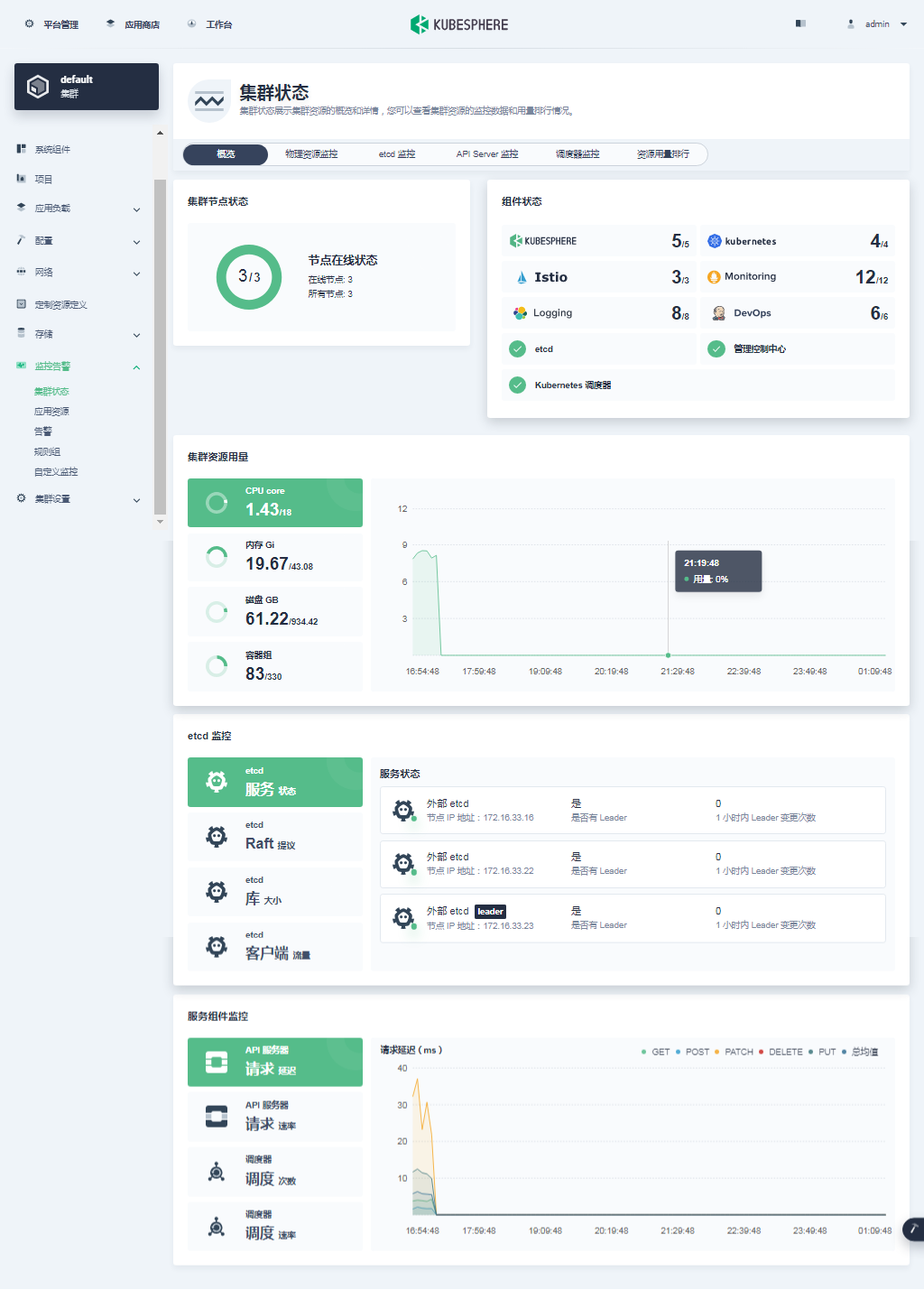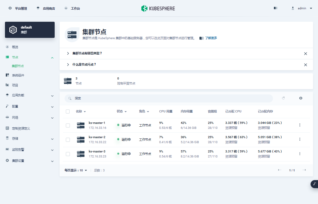 至此,我们已经完成了部署 3 台 服务器,复用为 Master 节点 和 Worker 节点的最小化的 Kubernetes 集群和 KubeSphere。我们还通过 KubeSphere 管理控制台和命令行界面查看了集群的状态。