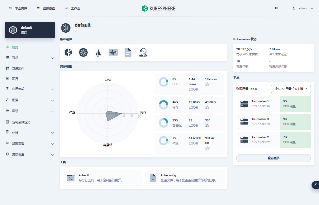 部署完成后,我们还利用 KubeSphere 管理控制台和 Kubectl 命令行,查看并验证了 KubeSphere 和 Kubernetes 集群的状态。