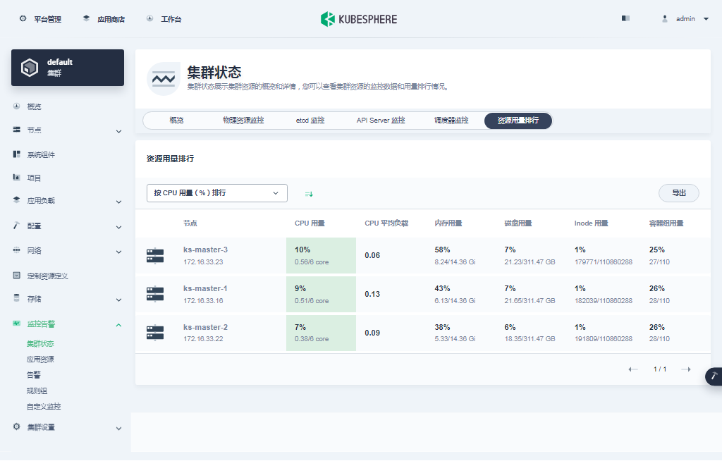 | ks-master-3 | 172.16.33.23 | 6 | 16 | 50 | 200 | KubeSphere/k8s-master |