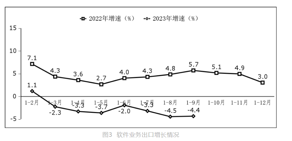 软件业务出口降幅收窄。前三季度,软件业务出口364亿美元,同比下降4.4%。