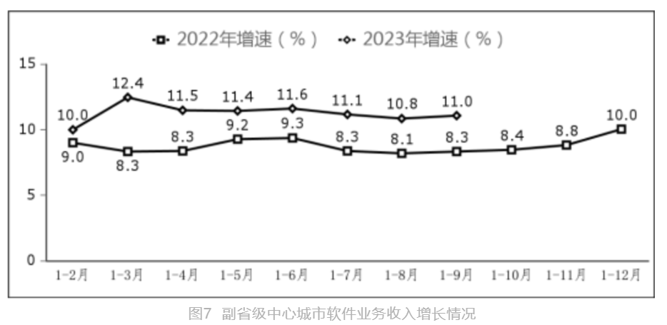 中心城市软件业务收入平稳增长。前三季度,全国15个副省级中心城市实现软件业务收入42538亿元,同比增长11%,增速较1—8月份提高0.2个百分点,占全国比重为48.6%,占比较去年同期回落1个百分点。其中,大连、济南、青岛、深圳、厦门、沈阳和成都软件业务收入增速超过全行业整体增速。