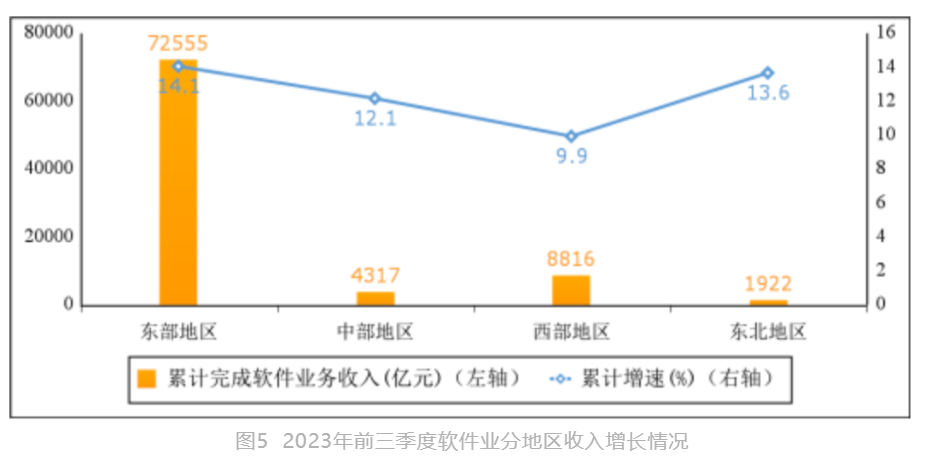 中、西部地区软件业务收入小幅回落,东部地区增势突出。前三季度,东部地区完成软件业务收入72555亿元,同比增长14.1%,增速较1—8月份提高0.1个百分点;中部地区完成软件业务收入4317亿元,同比增长12.1%,增速较1—8月份回落1个百分点;西部地区完成软件业务收入8816亿元,同比增长9.9%,增速较1—8月份回落0.2个百分点;东北地区完成软件业务收入1922亿元,同比增长13.6%,增速较1—8月份提高0.3个百分点。四个地区软件业务收入占全国比重分别为82.8%、4.9%、10.1%和2.2%。
